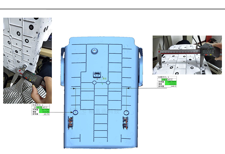 2、将三维扫描获得的数据进行简单修整,做填补标记点,去除杂点处理后,将扫描数据导入三维检测软件里,按客户要求测量孔间距部位的数据,生成三维检测报告发送给客户。