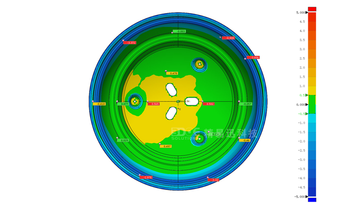 使用手持式三维激光扫描仪采集钣金冲压件的外形3D数据,然后将扫描得到的三维点云数据导入3D数模检测软件中,做3D数模检测对比,得到工件的偏差分布色谱图。在色谱图上对重点区域进行创建注释,得到该区域的具体偏差数值。通过此方法,可以快速准确的完成钣金冲压件的加工精度检测。